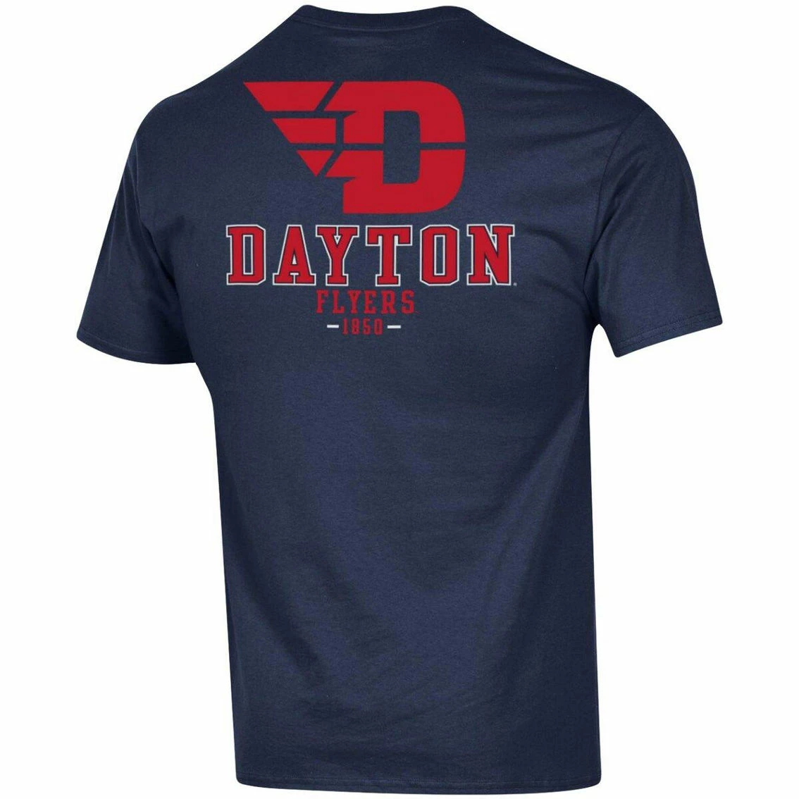 - People coming or going will see your Dayton Flyers fandom when you wear this Stack 2-Hit T-shirt from Champion. It features the Dayton Flyers logo on the front and team graphics printed on the back. Additionally, the cotton material provides a comfortable feel.