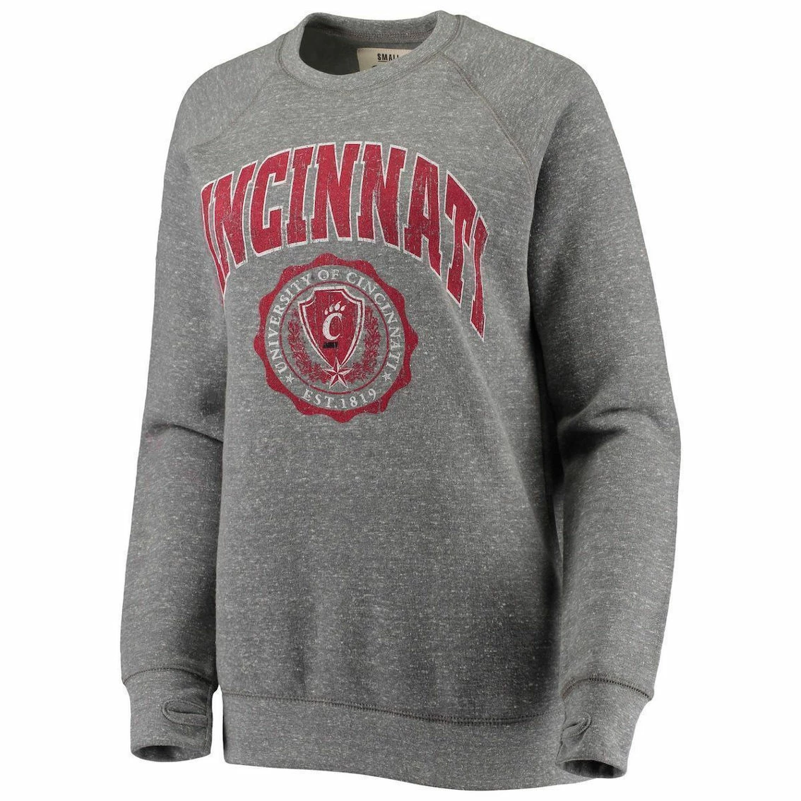 SKU: DSCO1144960611 Category: Cincinnati Bearcats Tags: Clothing & Accessories, Hoodies & Sweatshirts, Pressbox Women's Heathered Gray Cincinnati Bearcats Edith Vintage Knobi Raglan Pullover Sweatshirt